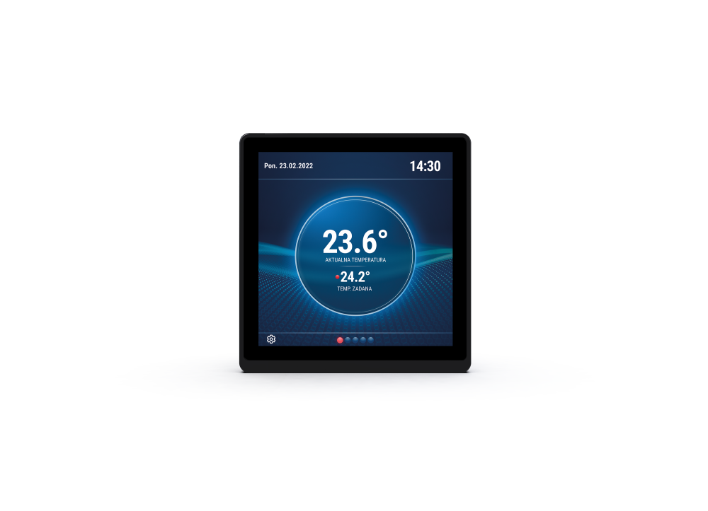 Kontrolní panel CP-04 slouží jako multifunkční zařízení. Díky němu můžeme zobrazovat aktuální předpověď počasí, kontrolovat teplotu v místnosti, ve které je instalován (možnost připojení čidla teploty vzduchu a čidla teploty podlahy) a nastavovat zkratky k oblíbeným scénám. Panel tedy funguje jako zobrazovač počasí, regulátor teploty a přepínač scén. To vše se ovládá ze 4palcového barevného dotykového displeje.