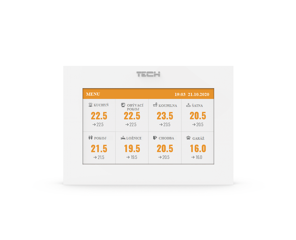 Regulace zobrazuje a umožňuje kontrolu činnosti všech parametrů systému podlahového vytápění.