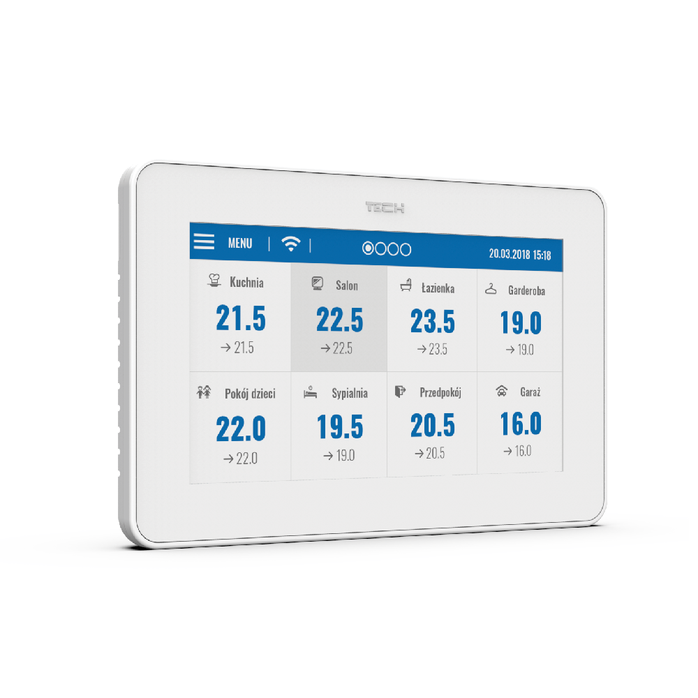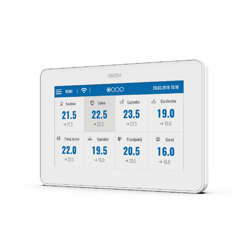 Dotykový panel umožňuje jednoduché ovládání podřízených zařízení. Pro upravení parametrů dané zóny je potřebné kliknout na část displeje s informacemi o jejím stavu. Vzhled displeje kontrolního panelu regulace vytápění je možné přizpůsobit svým potřebám ve funkci nastavení displeje. Uživatel má možnost nastavit spořič displeje ve formě datumu nebo času. Dále má možnost výběru barevného tématu displeje a zapnout nebo vypnout zvuk tlačítek